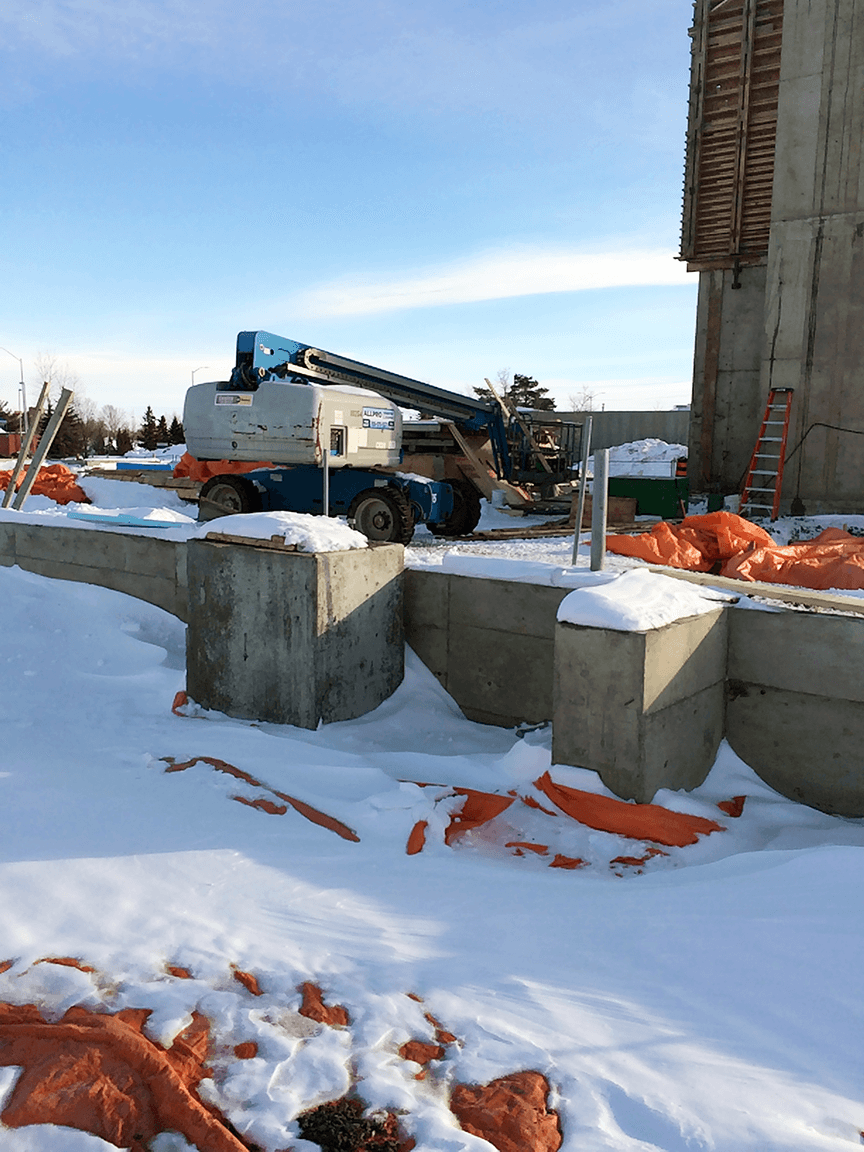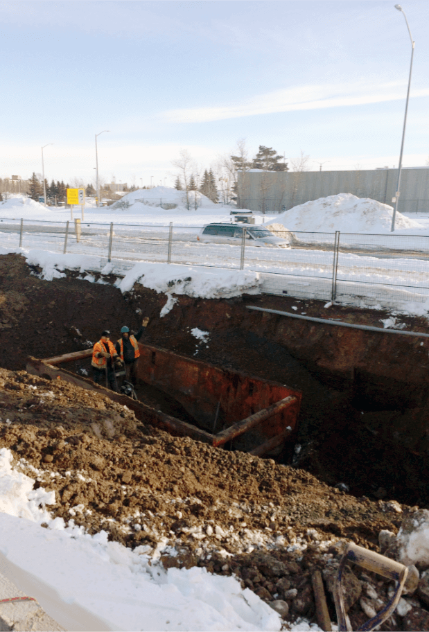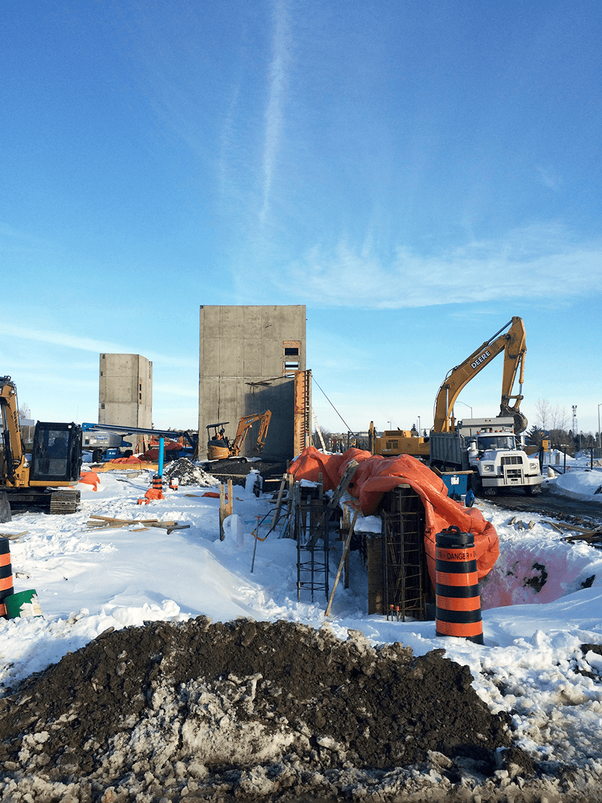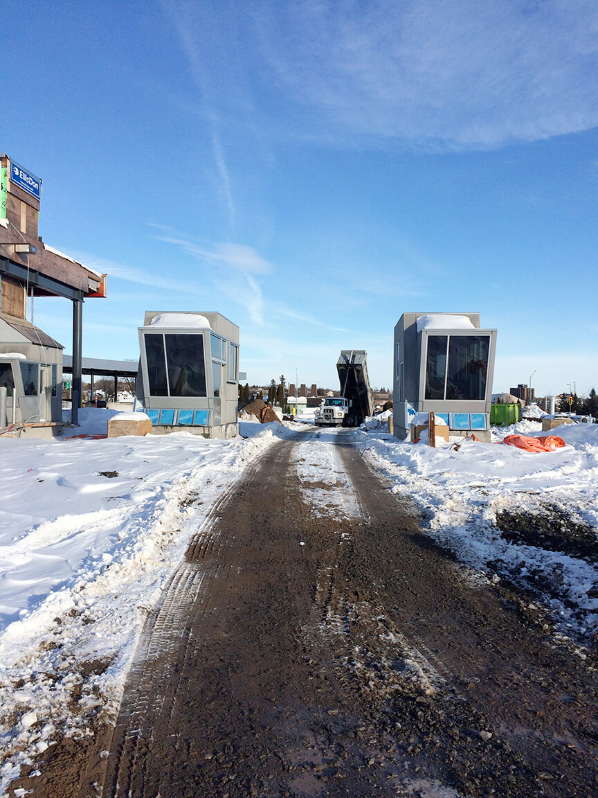 The newly installed bi-level booths (top left), ongoing excavation for storm main installation (top right), and stair towers and foundations for the commercial building nearing completion (bottom).